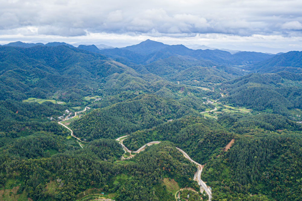 这是2025年7月22日在海南省保亭黎族苗族自治县毛感乡拍摄的热带雨林及蜿蜒其中的环热带雨林国家公园旅游公路(无人机照片)。新华社记者蒲晓旭摄